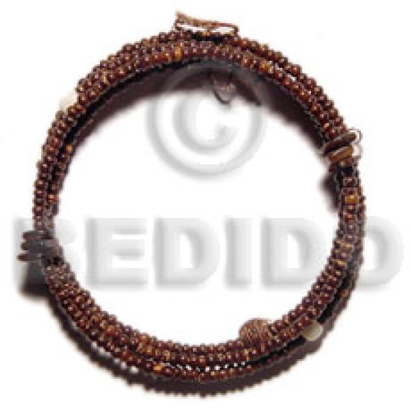 2-3mm coco Pokalet nat. brown hoop wire bracelet/adjustable shell & wood beads..
