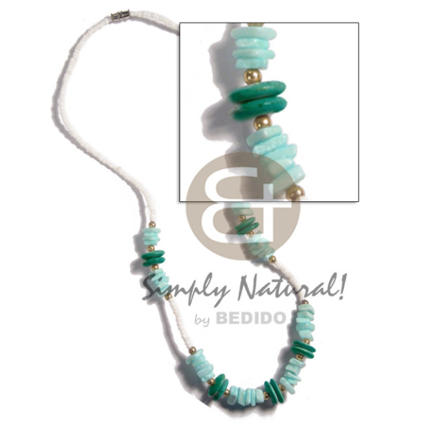 2 rows coco heishe bleached sq. cut gold lip & wood bead MOP fang pendant..