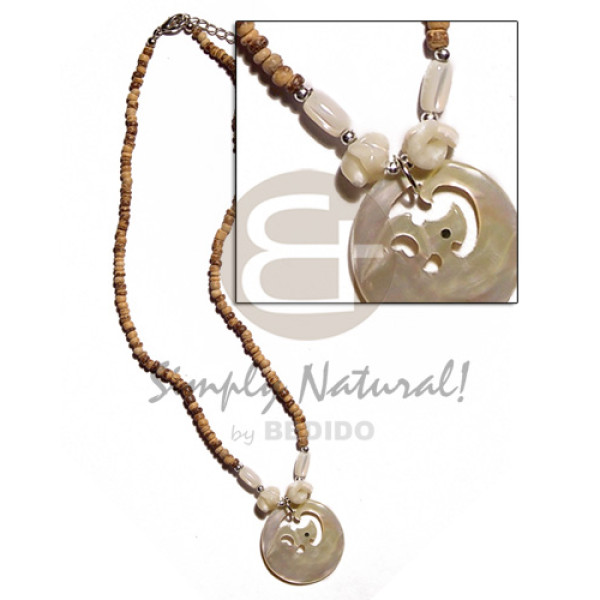 2-3mm tiger coco pokalet wire choker bone beads & shells accent and 40mm round swirl MOP pendant..