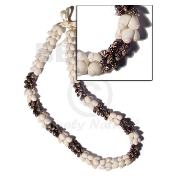 2 rows 2-3mm coco Pokalet tiger & bleach nassa shell and dangling coco flower..