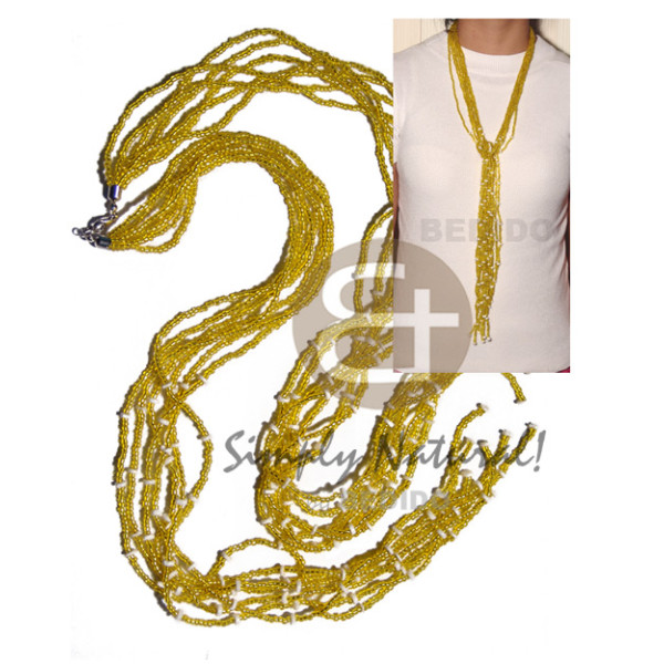 scarf necklace - 7 rows yellow glass beads tassled white clam / 36 in...