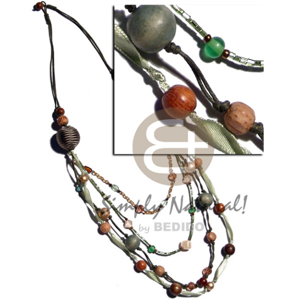 olive green tones/ 2 layers wax cord matching wrapped 20mm wood beads, 4 graduated layers of metal ..