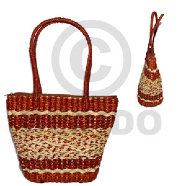 pandan indo braided with zipper/ 17x6 1/2x 13 in. / handle 9 in. dangling brown.bleach coco ring & ..