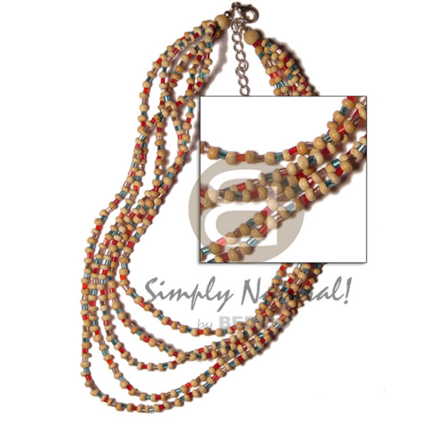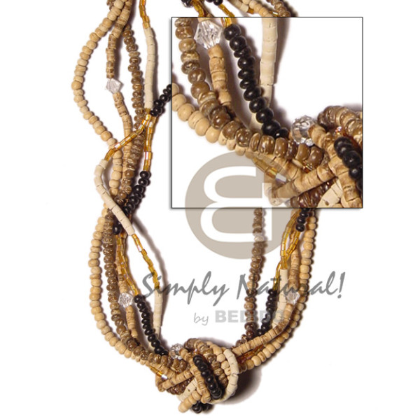 5 layers intertwined 4-5mm coco Pokalet. in metallic copper tones glass beads and 75mm round lamin..