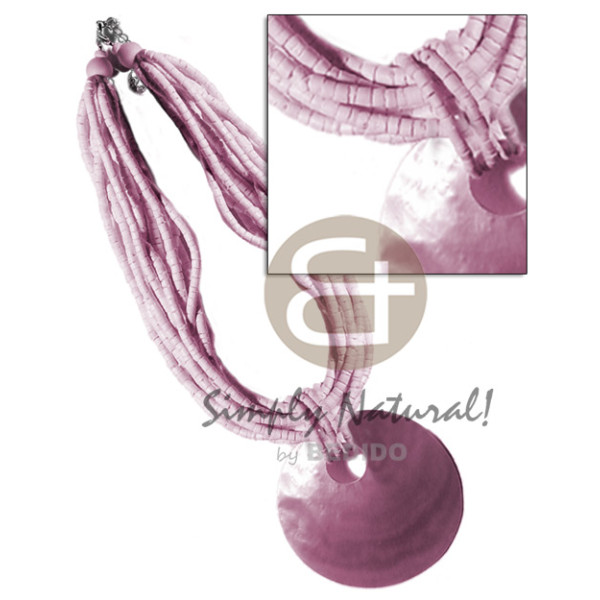 3 rows raffia in graduated length 21 pcs. round 18mm pink hammershell and glass beads accent..