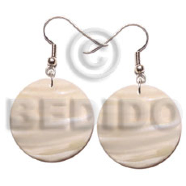 dangling round laminated brownlip brasswire trimming and black resin backing..