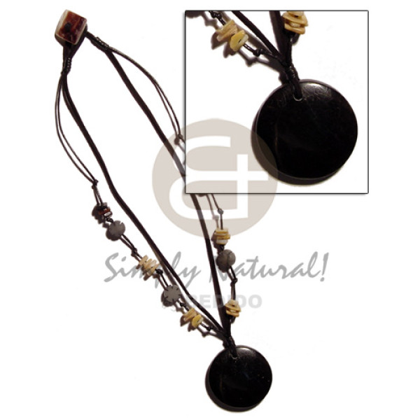 tassled round 55mm blacktab pendant on leather thong pearl beads and buri nuggets accent / 32 in...