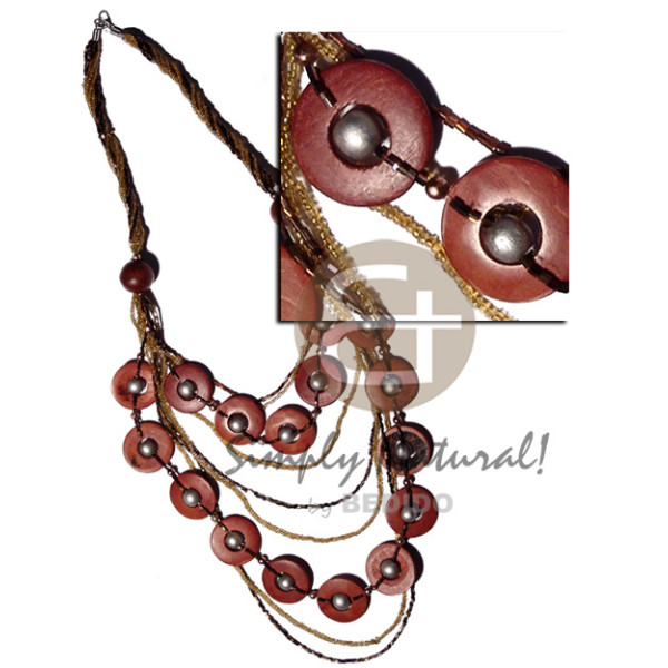 9 graduated layers of cut/glass beads combination 30mm dyed nat. wood rings, wood beads and pearl ..