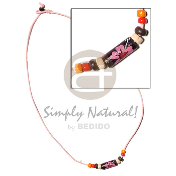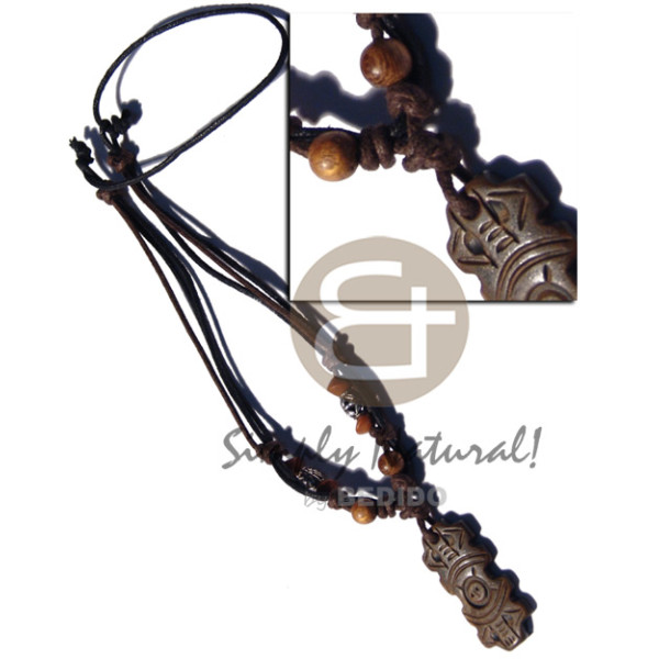tribal wooden shield carved 44mmx25mm pendant wood beads/metal accent in double wax cord / 23in...