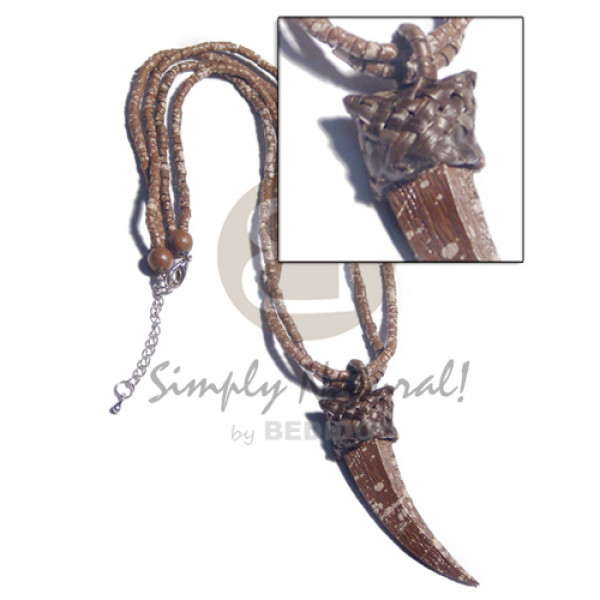 2 rows brown marbled 2-3mm coco heishe matching 70mmx20mm textured wood tooth pendant nito holder ..