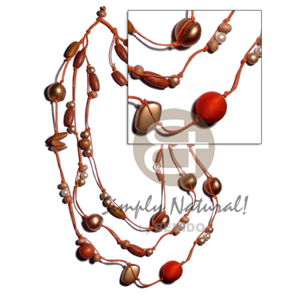 3 rows 16" 17" 18" wax cord asstd. wood beads, pearl, wrapped wood bead, pearlized kukui nuts in or..