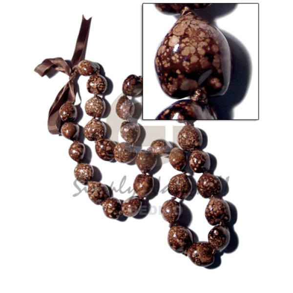 48 in. wax cord kukui, robles round wood beads & wrapped wood beads in brown tones..